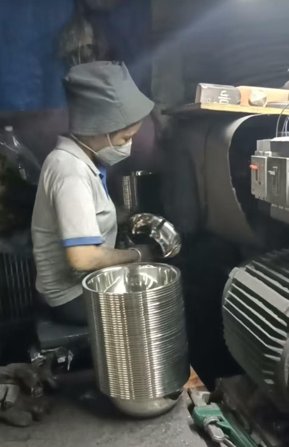 机器轰鸣、火花四溅,有工人将待加工的不锈钢盆放入机器中抛光,直至打磨平滑,随后放入另一个盆,如此循环,视频中工人的衣服、面部被染黑,有男工人因太热选择脱掉上衣……